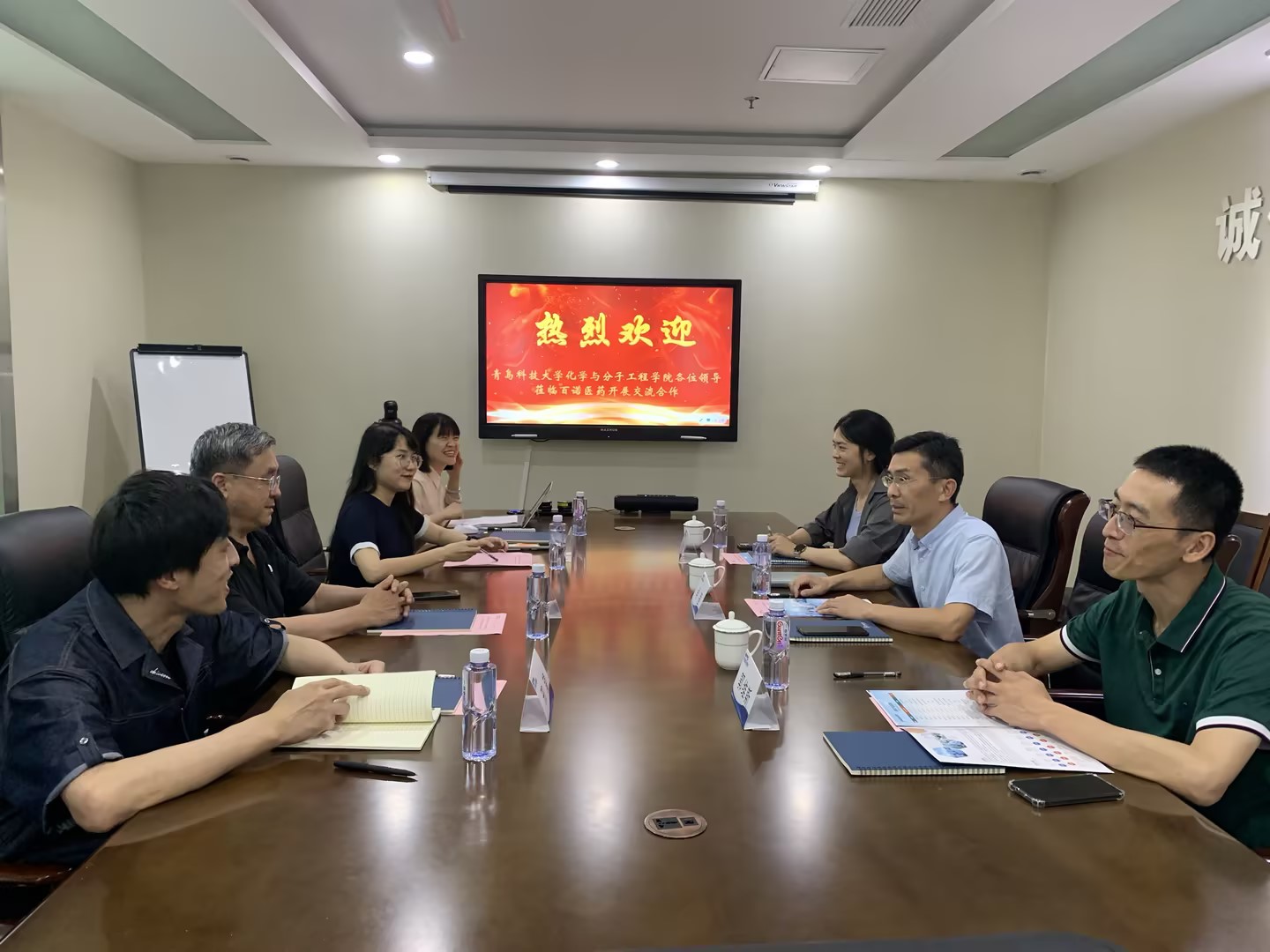 座谈会上,卢朋尧代表山东百诺医药股份有限公司首先对肖强一行表示热烈欢迎,回顾了与化学院的合作交流历程,并介绍了百诺医药的发展现状。随后,肖强代表学院对此次活动表示高度认同,指出百诺具有完善的科研管理体系、稳健的人才梯队以及优质的产品与服务。此次座谈会围绕校企课程共建、科研合作以及人才招聘与就业等内容,展开充分研讨。双方在本科课程共建、研究生联合培养、实习实践基地建设、科研项目以及学生职业发展指导等方面,达成初步合作共识。