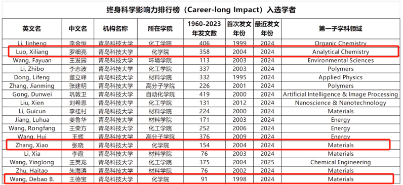 近日,美国斯坦福大学(Stanford University)和国际权威学术出版社爱思唯尔(Elsevier)共同发布了2024年度全球前2%顶尖科学家榜单(World's Top 2% Scientists 2024)。榜单分为“终身科学影响力排行榜(1960-2024)(Career-long Impact)”——关注整个学术生涯迄今的影响力和“2024年度科学影响力排行榜(Single-year Impact)”——聚焦本年度的学术成就。化学院3位学者入选全球前2%顶尖科学家——“终身科学影响力排行榜”,18位学者入选全球前2%顶尖科学家——“年度科学影响力排行榜”。