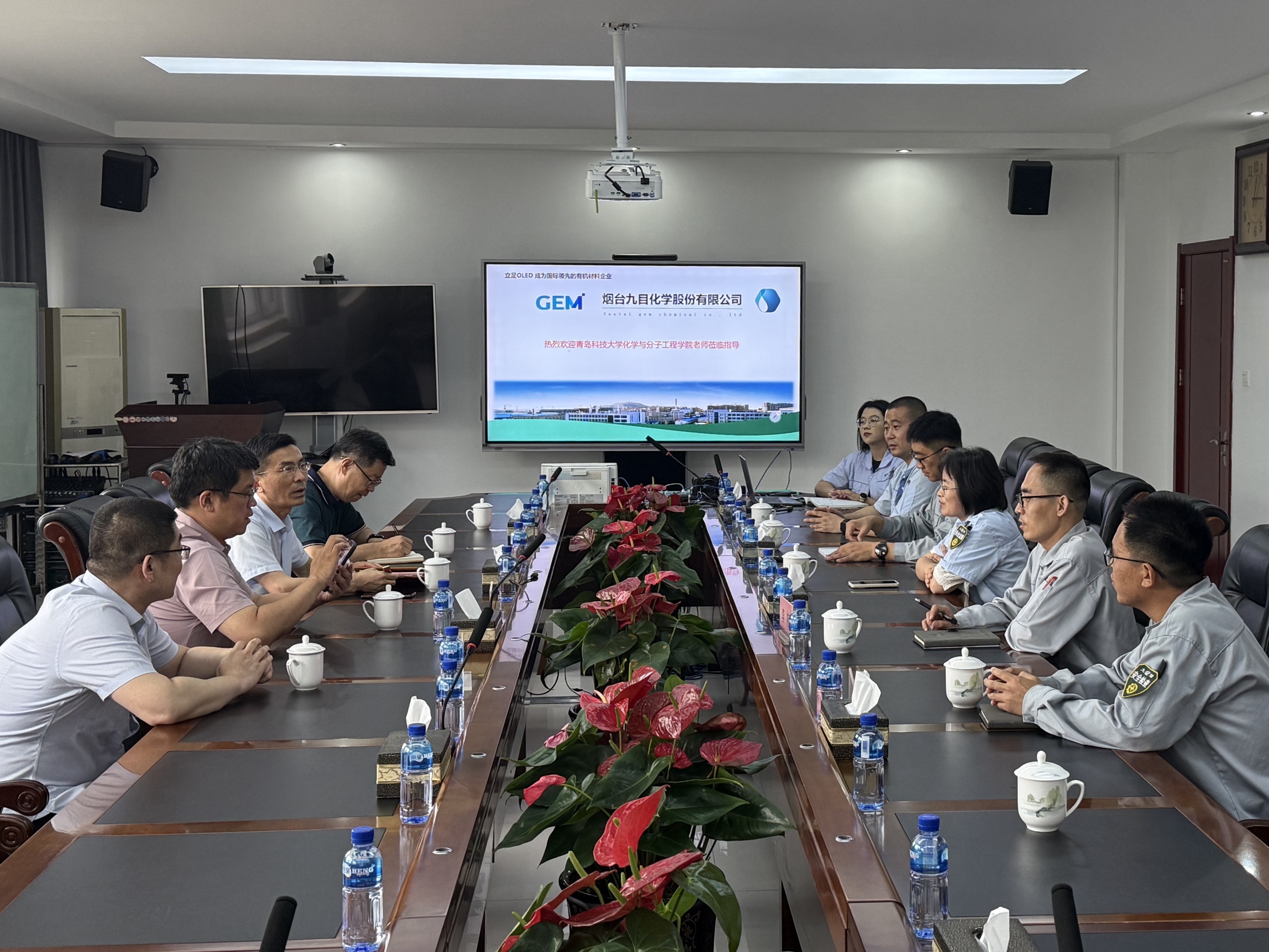 在烟台九目化学股份有限公司,肖强一行参观了企业的研发中心和生产车间,深入了解企业在精细化工领域的技术优势和产品应用。胡志强介绍了学院在有机化学、精细化工等学科方向的科研成果,双方围绕科研项目合作、技术难题攻关、招聘就业等方面进行了深入探讨,并希望通过人才联合培养的方式,为企业输送更多高素质专业人才。