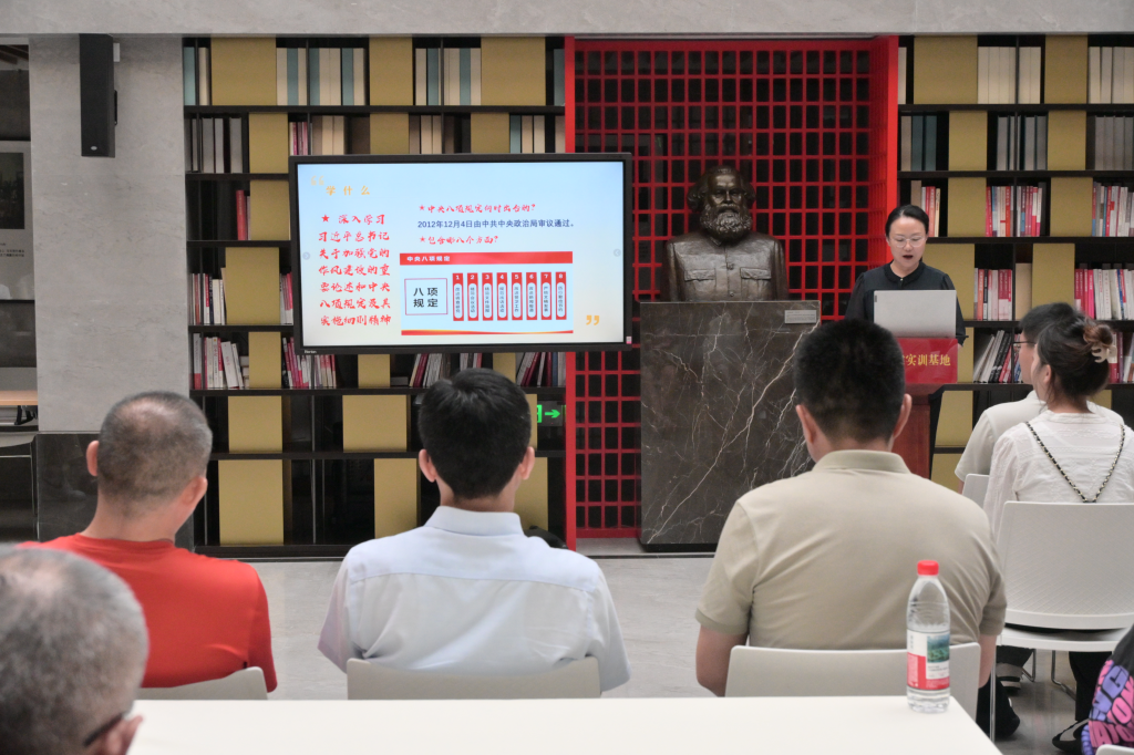 参观结束后,党员们随即开展了“中央八项规定精神”主题教育的微党课学习。主讲人深入解读了中央八项规定的出台背景、重大意义以及具体内容,从“学什么”“查什么”“怎么改”等方面,通过理论阐释和实际案例分析,引导党员深刻领会“八项规定”精神实质。