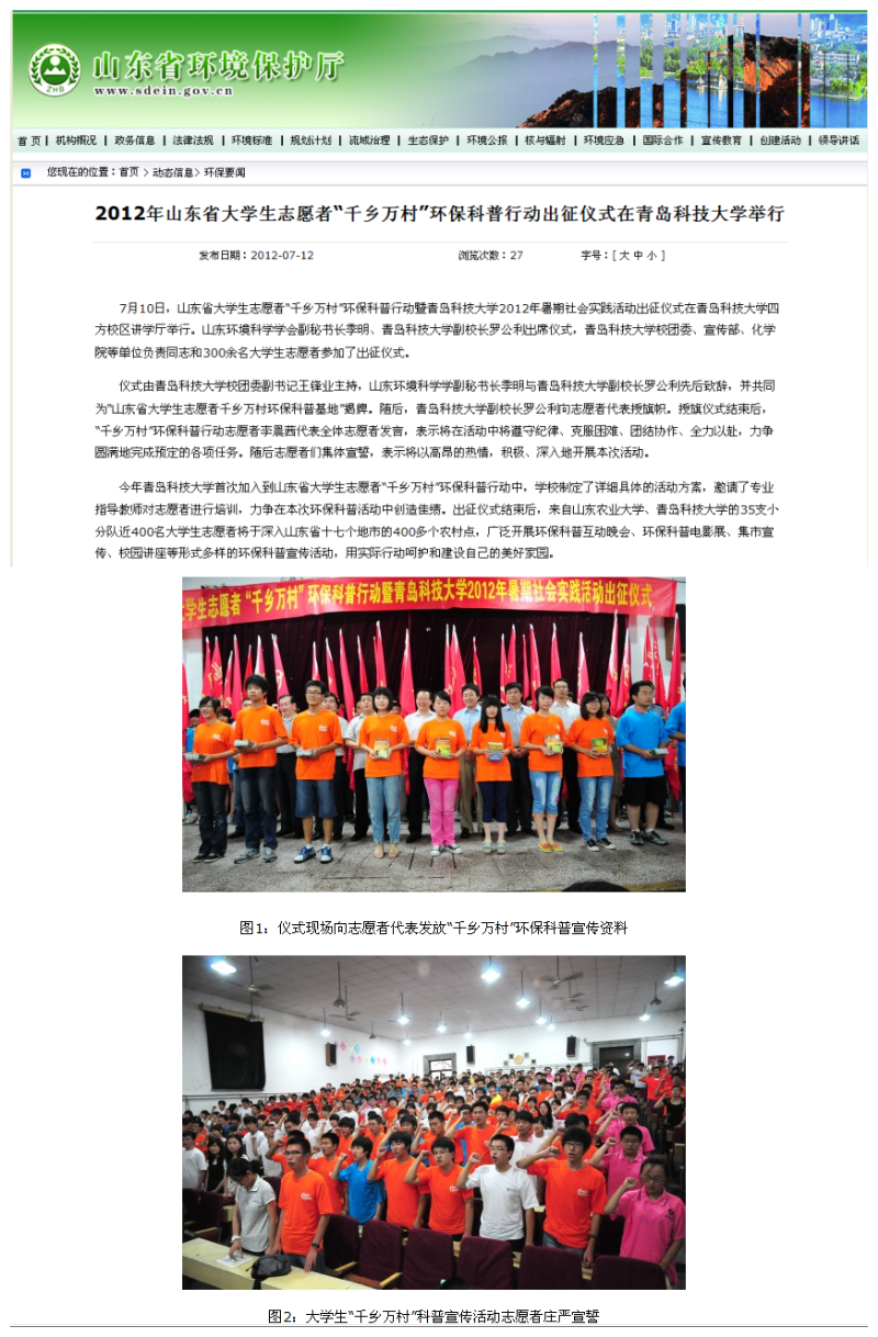 【山东省环保厅】2012年山东省大学生志愿者“千乡万村”环保科普行动出征仪式在青岛科技大学举行