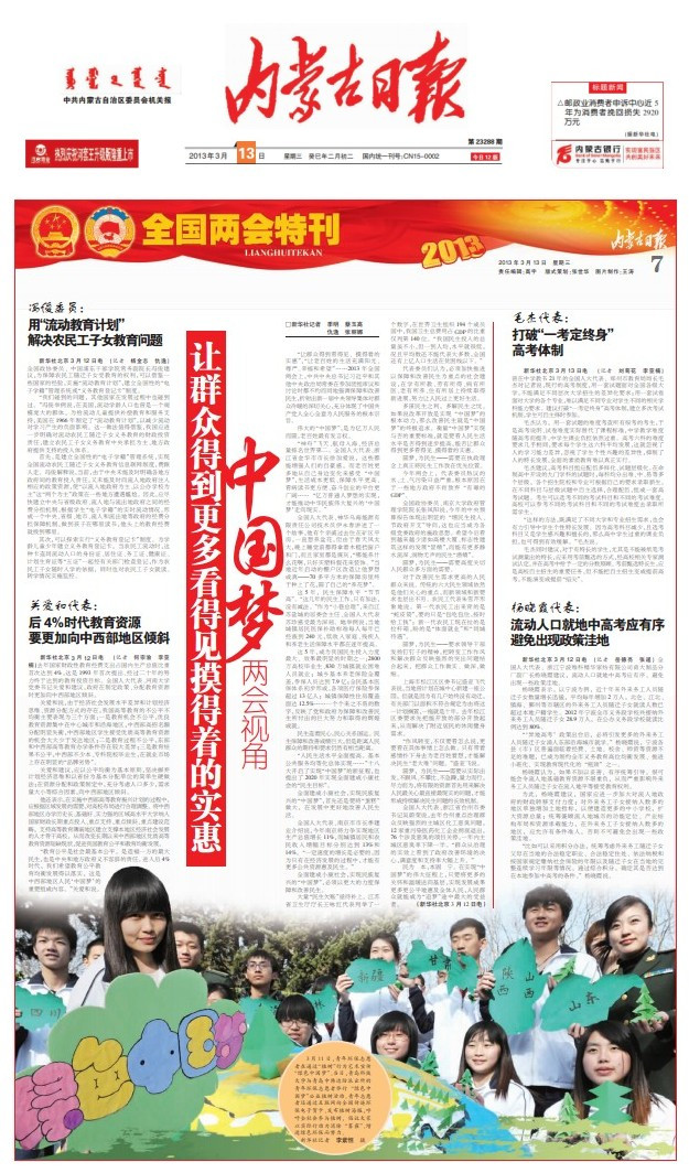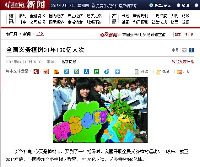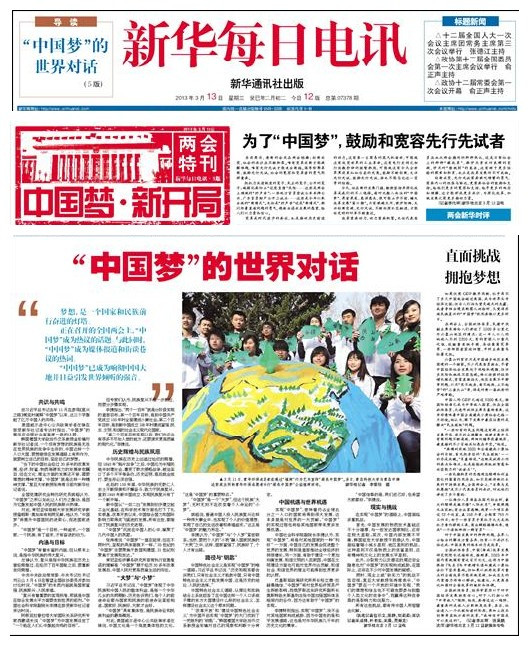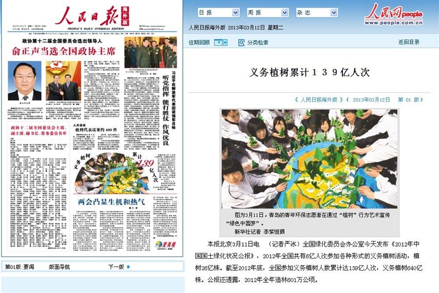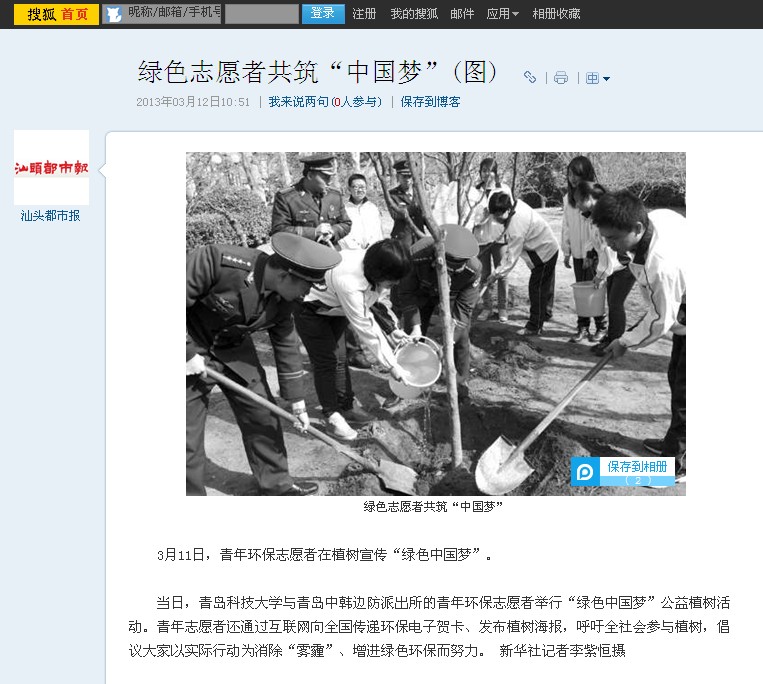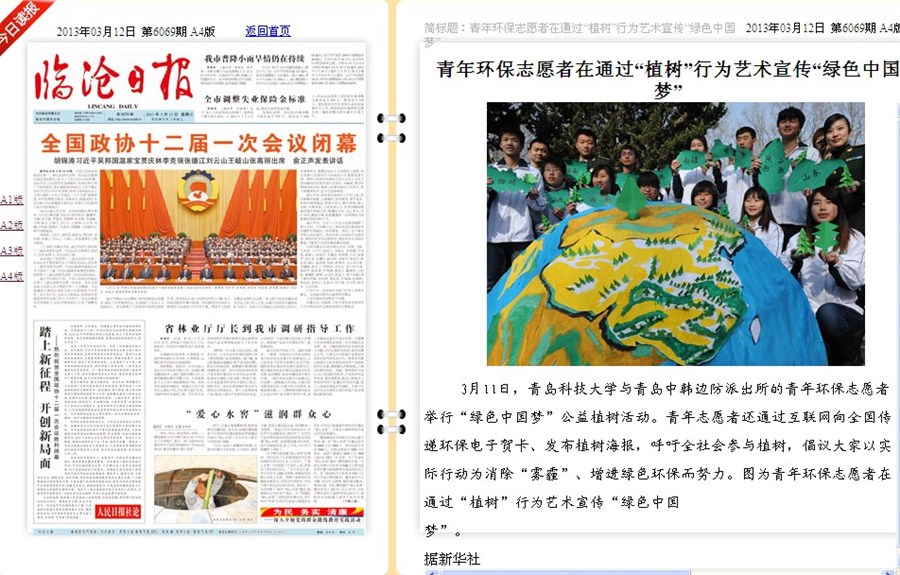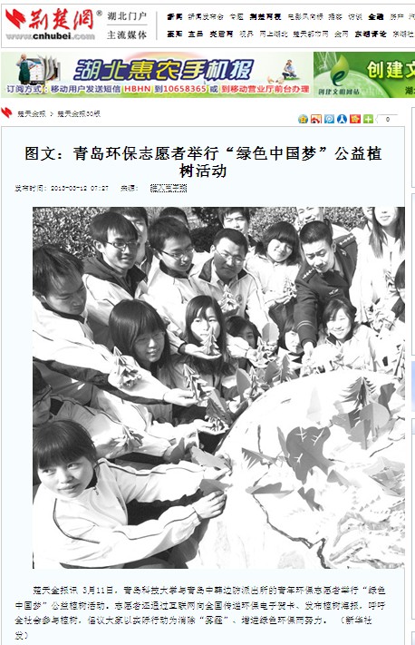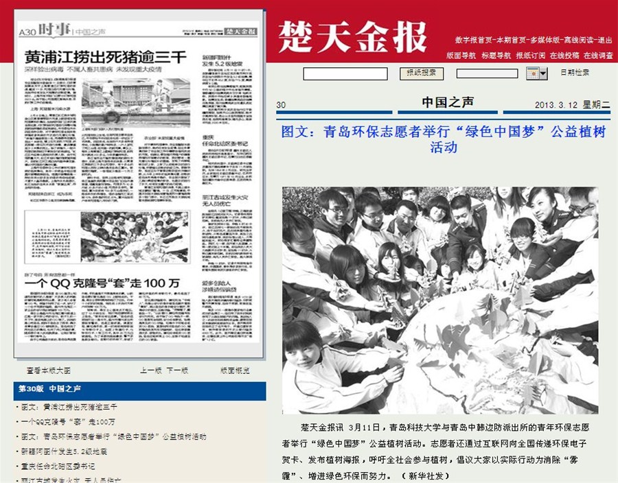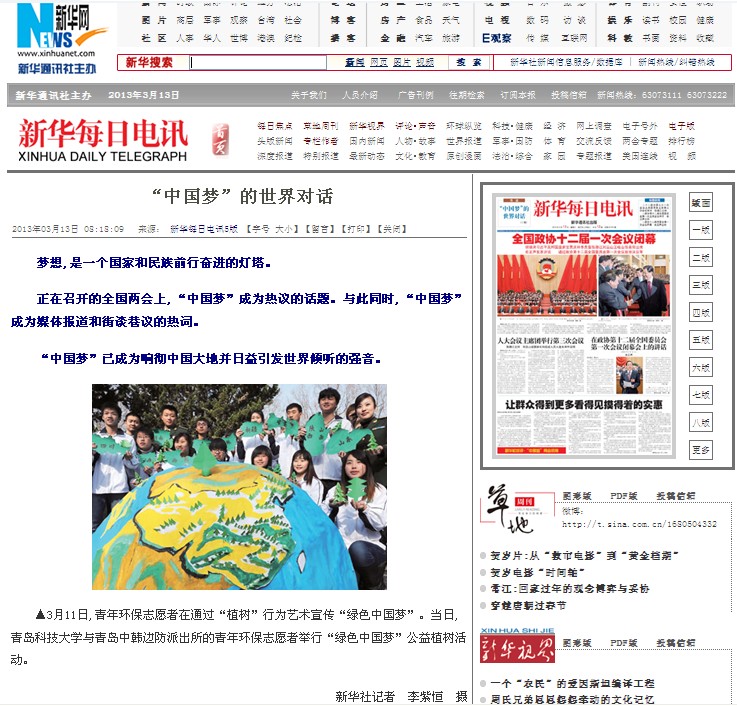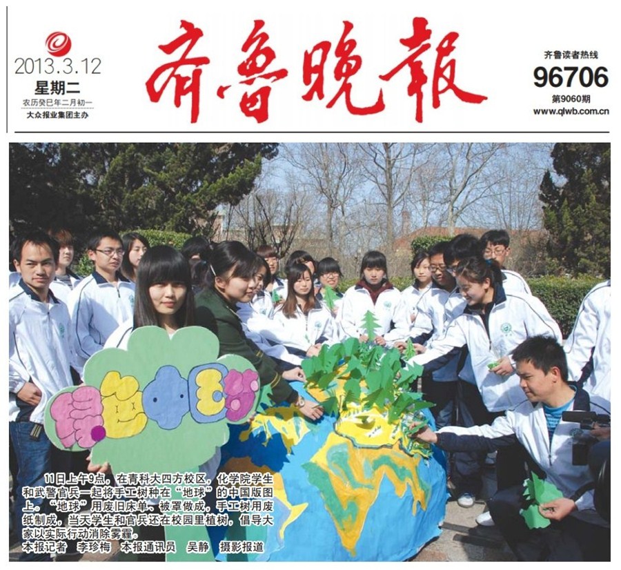 化学院学生和边防派出所警官用废旧的床单、被罩,手工做成圆形的地球,地球上突出了中国的版图,从不同省份的大学生和武警中遴选出来自全国各地的代表,共同制作手工树,并将“绿树”种植在自己的家乡版图上。手工树的地球被大学生和边防武警包围在中间,寓意在当前“中国梦”的大背景下,来自全国各地的大学生和边防武警代表,带着自己的梦想,立志在自己的家乡所在地,力所能及的植树造林,强化地球之肺,为祖国的绿色大好河山,贡献微薄之力。活动进行过程中,新华社记者李紫恒给予了积极评价,并用手中的相机记录了活动的整个过程,此外齐鲁晚报、半岛都市报、崂山区电视台现场报道了本次活动,海科112班范玲芳在接受采访中说道:大学生与边防武警还通过互联网向全国传递环保电子贺卡、发布植树海报,呼吁全社会参与植树,倡议大家以实际行动为消除“雾霾”、增进绿色环保而努力。1、《新华每日电讯》:中国梦的世界对话