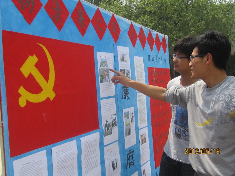 为增强党员干部的党性修养,提高廉洁自律意识,推进廉政文化建设,化学院党总支于5月中上旬面向学院师生尤其是党员干部开展了“扬清廉之风,反贪腐之气”为主题的廉政图片推荐和廉政警示语征集活动,活动得到了各党支部和党员的大力支持,经过认真筛选和评比,学院党总支将优秀推荐图片和优秀廉政警示语于5月19日下午在四方校区小五四北进行了展示。