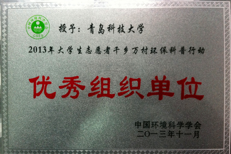 11月26日-30日,2013年大学生志愿者“千乡万村”环保科普行动经验交流暨表彰大会在东北师范大学自然博物馆举行。青岛科技大学获评2013年大学生志愿者“千乡万村”环保科普行动优秀组织单位,学院赴沂南实践团获评优秀小分队,王新萍获评优秀指导教师,高见阳获评优秀志愿者。