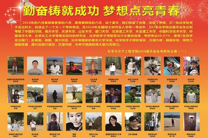 “谈体会·传经验”考研经验交流会。化学院2016届本科毕业生共有386人,有157人被中科院研究所、武汉大学、南开大学、大连理工大学、中山大学等知名院校录取,考研升学率为40.67%。此外,化学院共有13名同学考上博士,考博率达15.29%。化学院充分发挥榜样的力量,积极举办毕业生经验交流会。优秀毕业生代表分别从考研和学习、科技创新、社会实践和就业等方面分享成长经验,提供青春正能量。学院通过高年级对低年级的辐射连带模式,充分发挥青春榜样的引导作用,进一步增进同学们对大学生活的认识,明确了自己对未来的规划。