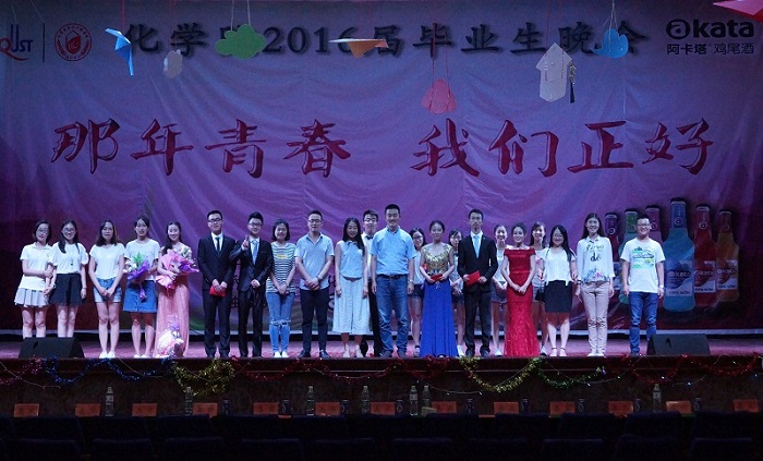 “那年青春·我们正好”2016届毕业生晚会。6月21日晚,化学院“那年青春·我们正好”2016届毕业生晚会在四方校区西礼堂举行。化学院领导老师和500余名应届毕业生共同观看了演出。晚会在乐队歌曲《IMAX》演奏中拉开序幕,创意节目《化学总动员》将化学元素与情景剧相结合,演绎出唯美的化学反应和校园生活;情景歌舞剧《青春不散场》、《独家记忆》、相声《青稞往事》再现了校园生活的美好过往,表达了毕业生对母校的深深爱恋;水鼓舞《中国龙》,鼓面洒水,演员们敲动鼓面,水花四溅,优美的舞姿,魅力无限的灯光频闪效果,演绎出灿烂振奋的舞风和鼓韵;晚会最后,化学院分团委老师倾情演唱的歌曲《明天会更好》,唱出了光阴如流水飞快的大学好时光,唱出了老师对毕业生的深切祝福。