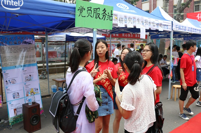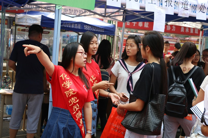 一幅幅温馨的党员服务标语,一句句热心的问候提示,成为化学院迎新工作现场一道亮丽的红色风景线。9月1日,化学院学生党员组成的迎新团队,把迎新工作作为“两学一做”学习教育的生动实践,充分发挥党员模范带头作用,努力争做服务先锋。