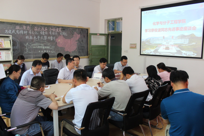 5月31日,化学院党总支召开“学习廖俊波同志先进事迹座谈会”。学院党政领导、教职工党支部书记参加会议,会议由党总支书记王德宝主持。
