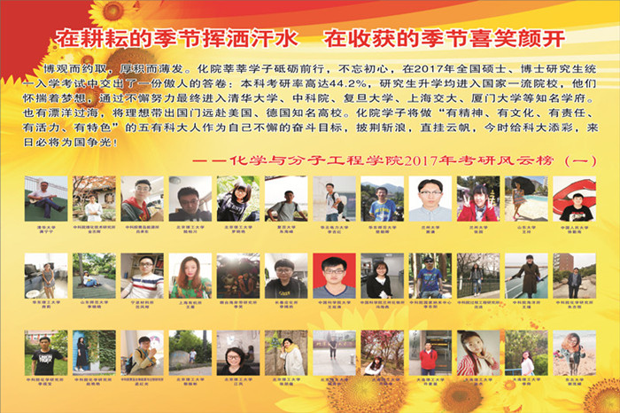 榜样风采,引领成才路。化学院2017届本科毕业生共有364人,其中162人被中科院研究所、吉林大学、武汉大学、南开大学、大连理工大学等知名院校录取,考研升学率为44.5%。此外,有16名同学考取博士。为凝聚榜样青春力量,激励化院学子争做科大“五有”青年,开展考研风云榜展示活动,并通过“微观化院”微信平台与全院同学进行互动,通过高年级对低年级的辐射连带模式,充分发挥青春榜样的引领作用。