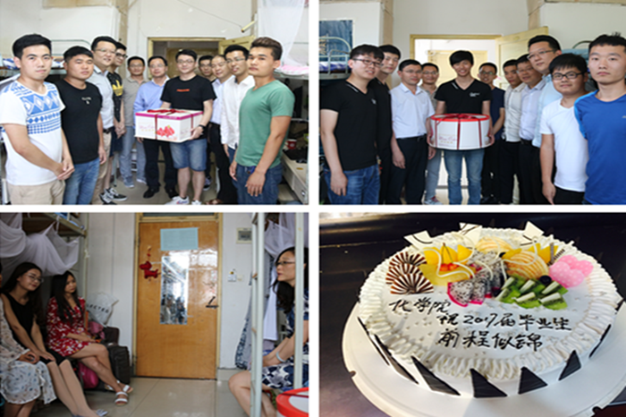 情暖毕业生,温馨送别服务。6月19日-21日,化学院党政领导、分团委辅导员走访毕业生宿舍,为毕业班级送去蛋糕。院长罗细亮与毕业生亲切交谈,叮嘱毕业生一定要注意人身及财产安全,做到安全离校、文明离校。