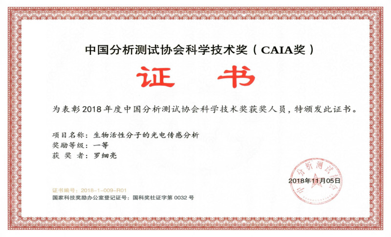 “CAIA奖”2015年经国家科学技术奖励办公室正式登记批准,是我国分析测试领域唯一的国家正式承认的社会力量设立的科学技术奖。该奖设立于1993年,每年评审一次,旨在奖励分析测试领域新原理、新方法、新技术和新应用研究中取得优秀成果的科技工作者和组织单位。“生物活性分子的光电传感分析”项目的研究成果是构建在复杂生物样品中实现特异性检测的光电化学生物传感新体系,通过对活性分子的可视化监测以及靶向药物释放,实现对肿瘤细胞的抑制从而达到化疗的效果,可以广泛应用于疾病诊断及医养健康等领域。后续工作中,该项目将与青岛市多家医院交流合作,进行大量的实际样品检测和临床医学应用。