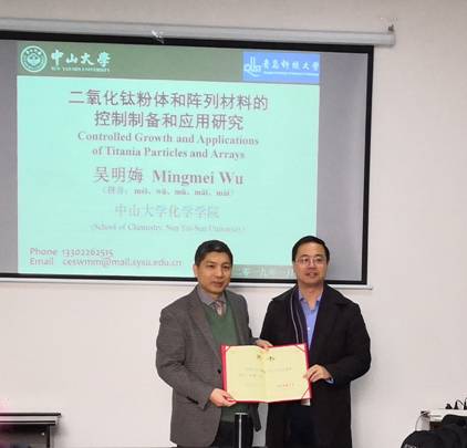 聘任仪式后,吴明娒教授作了题为“二氧化钛粉体和阵列纳米材料的控制制备和应用研究”的学术报告。报告中,吴明娒教授讲解了在控制制备锐钛矿和金红石二氧化钛纳米晶体的基础上,利用外延生长和拓扑化学转化,控制生长具有特定微纳结构的阵列材料。结合外延生长,控制了晶体的特定取向生长以及引入了具有特定界面结构的新型同质或异质结构材料。并介绍了材料生长取向与光催化和储锂性能之间的关系。