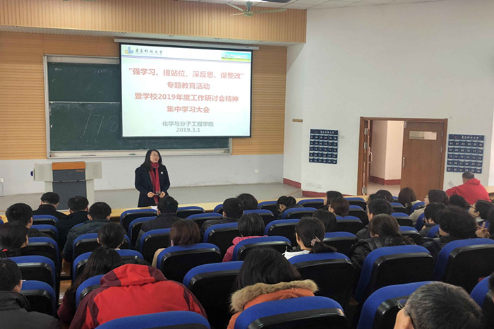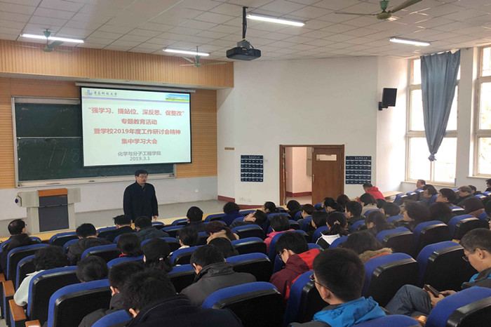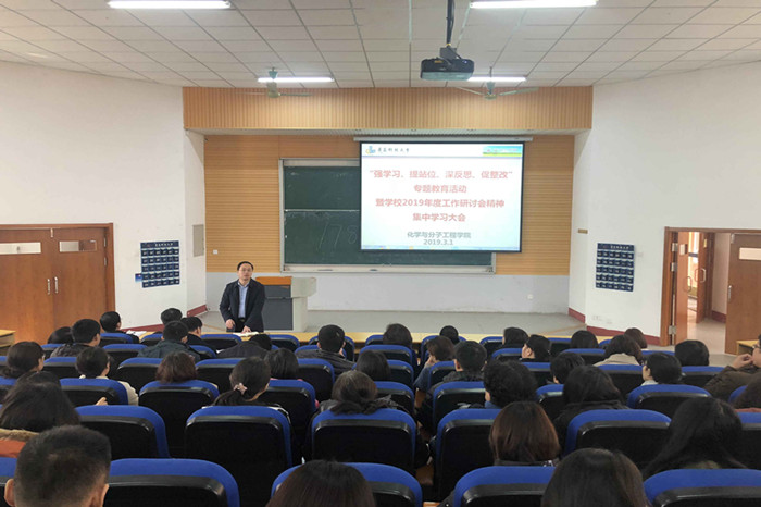 3月1日上午10点,化学学院在2教101教室召开“强学习、提站位、深反思、促整改”专题教育活动动员大会暨新学期工作部署会。会议由党总支书记王德宝主持,学院全体教职工参与会议。