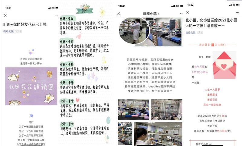 深挖网络思政,促进协同发展。近日,学院官微“微观化院”新增“化小研”栏目,通过线上的网络思政促进本科生与研究生的交流。以“化研•青知”“化研•青思”“化研•青榜”“化研•青活”“化研•青学”“化研•青听”六个板块为载体,全面打通“研本化合工程”线上线下的思政育人平台,深度融入学科建设大局,形成学生自我教育、自我管理、自我服务的体制机制。化学院将持续推进“德育铸魂、智育固本、体育强基、美育化人、劳动淬炼”为主题的“研本化合工程”,做到“三全育人、五育并举”。