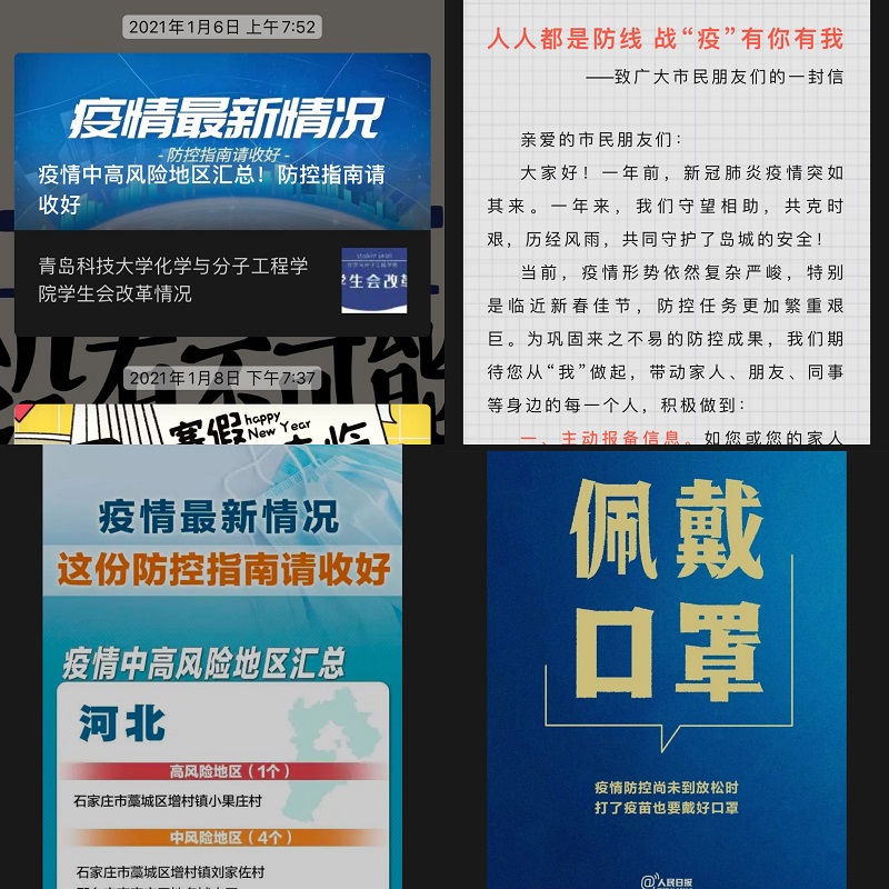 加强宣传,落实健康教育。采取“线上+线下”的方式加强宣传教育,借助学院官方微信公众号,及时转发权威资讯,普及疫情防控知识。向化学院全体学生发布倡议书,引导学生科学认识疫情、加强寒假离校返乡途中防护、提高疫情防控意识。