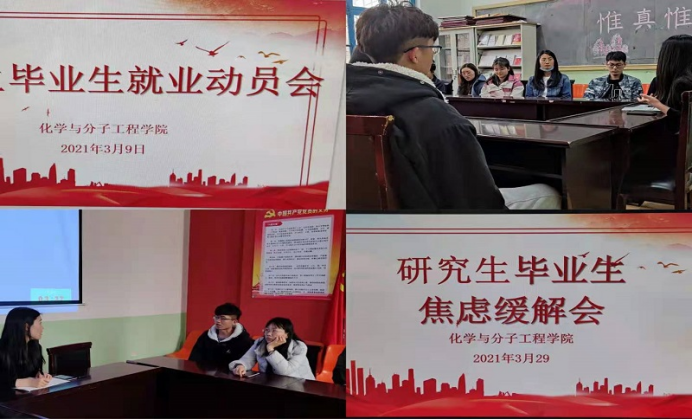 此次研究生毕业生的就业动员会暨毕业生焦虑缓解会,讲解了当前的就业形势、政策,给予毕业生们有效的就业指导,同时也给还未找到工作的毕业生信心,缓解了他们的就业焦虑。化学院为2021届毕业生提供了就业指导工作,旨在为毕业生顺利毕业、精准就业保驾护航。
