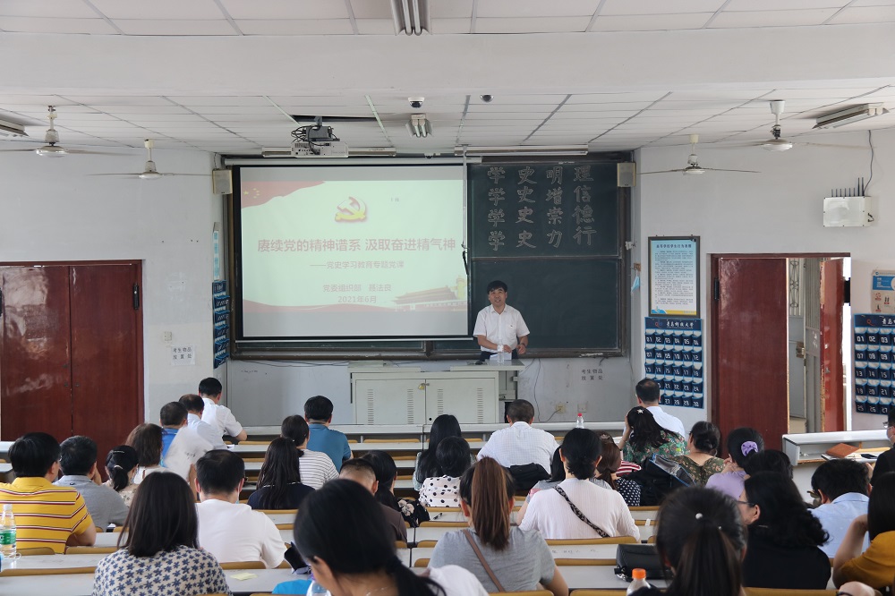 聂法良以“赓续党的精神谱系,汲取奋进精气神”为题,从精神世界、精神状态、中国共产党精神产生基础、中国共产党具体精神主体对中国共产党精神谱系展开多维分析,详细讲述了“认真学习党的精神谱系”、“深刻体会中国共产党人的精神谱系的核心理念”、“汲取奋进精神”三个方面的内容。他指出党史是最好的教科书,是最好的营养剂,广大教工党员要从党的精神谱系中汲取前进的力量,树立坚定的理想信念、根植强烈的家国情怀、弘扬不畏艰难的气概、培养勇于创新的精神、崇尚严于律己的品德,用党的光荣传统和优良作风凝聚力量、砥砺品格,增强“四个意识”、坚定“四个自信”、做到“两个维护”,焕发继往开来干事创业的壮志豪情,在“两个一百年”历史交汇的关键节点,以立德树人作为根本出发点和落脚点,引导当代大学生修好党史这门“必修课”,把党史学习教育融入课程体系,打造三全育人格局,彰显思政教育效果。