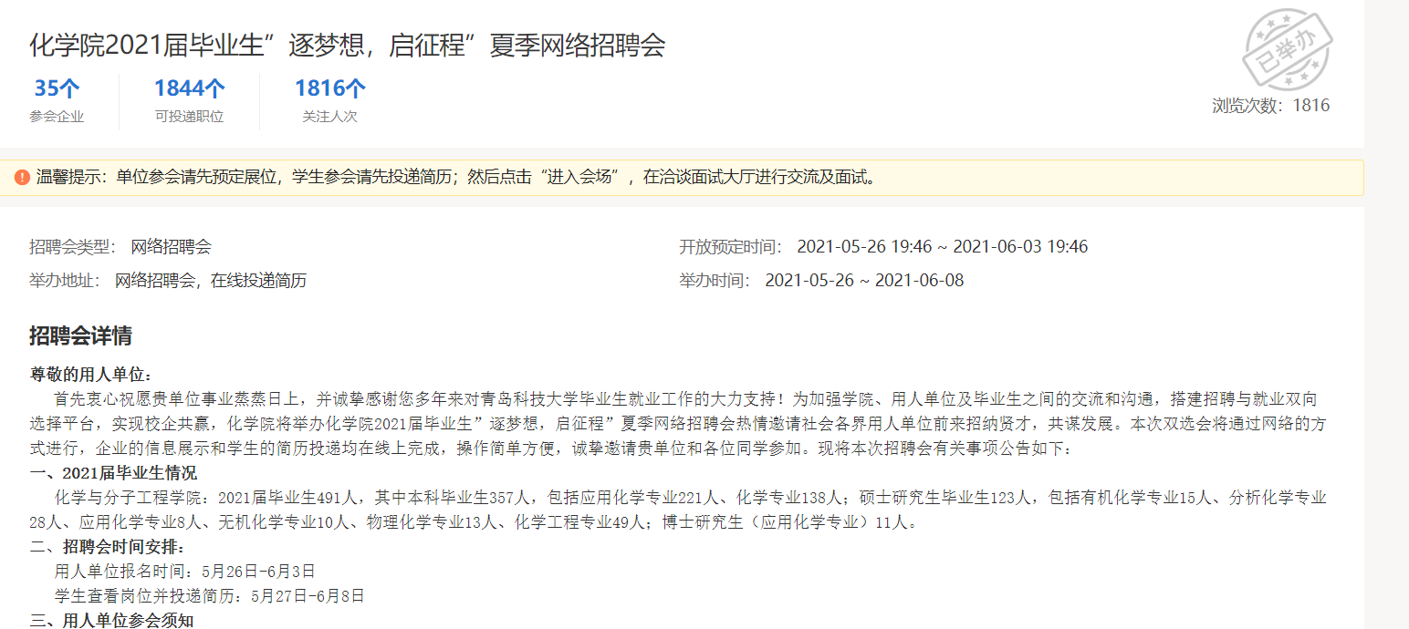 2021年5月26日至6月8日,化学院2021届毕业生“逐梦想,启征程”夏季网络招聘会成功举办。本次招聘会采取网络的方式进行,企业的信息展示和学生的简历投递均在线上完成,操作简单方便,极大节省了企业和毕业生的时间等各方面成本。