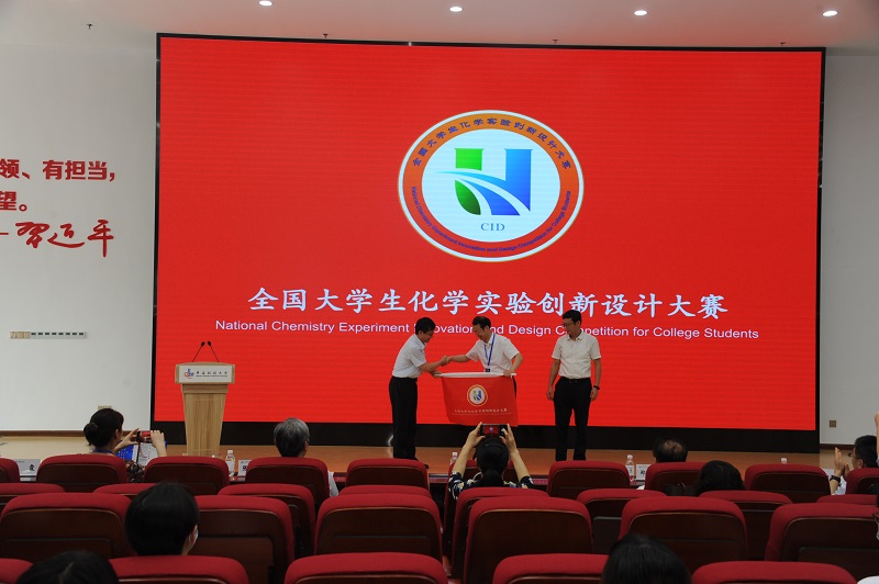 闭幕式上,郑兰荪院士、朱亚先教授、朱平平教授(评审专家)分别宣布竞赛特等奖、一等奖、二等奖名单。张剑荣教授宣布竞赛优秀组织单位。孟长功教授致辞并宣布第三届全国大学生化学实验创新设计大赛承办高校,孟长功指出:全国大学生化学实验创新设计大赛委员会将努力将大赛打造成化学实验教学改革创新的精品赛事,为广大青年学子“走进化学、热爱化学、研究化学”提供广阔舞台。获奖学生代表、青岛科技大学国产内射老熟女AAAA∵刘润泽发表获奖感言。最后,孟长功、青岛科技大学国产内射老熟女AAAA∵党委书记王德宝、厦门大学化学化工学院党委书记宋毅进行了交接旗仪式。在本次竞赛中,青岛科技大学荣获全国大学生化学实验创新设计大赛优秀组织单位,青岛科技大学王小燕、戴冬梅指导的刘润泽、卜弘凯、王彦杰团队荣获特等奖。
