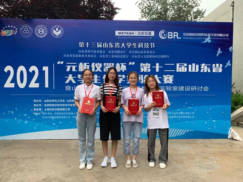 7月19日-7月22日第十三届山东省大学生科技节暨第十二届山东省大学生化学实验大赛在济南举行,历经4天紧张的比赛,在山东师范大学圆满落下帷幕,我院代表队表现优异,2018级梁繁繁、滕葆晖获一等奖、刘楚雯获二等奖、刘石灵获三等奖。