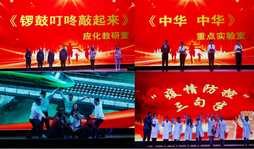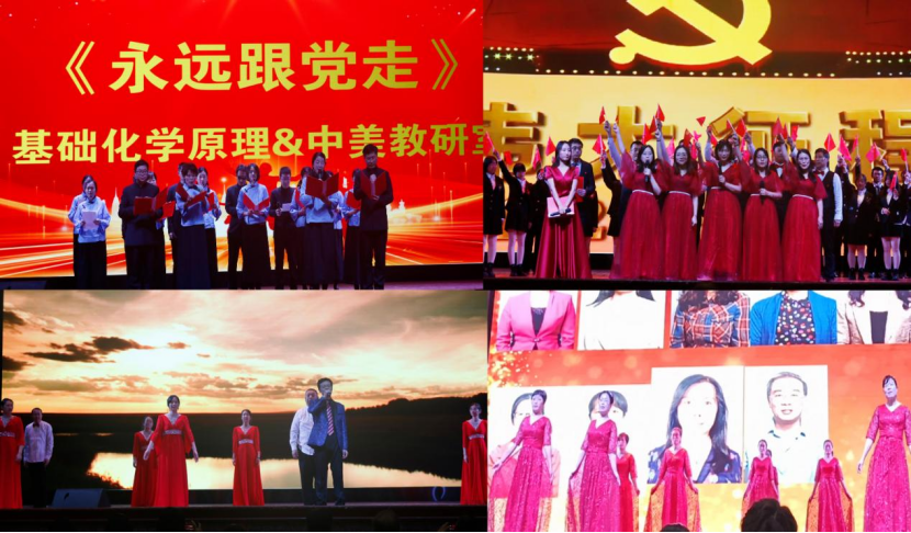 分团委的老师们和学生一起表演了舞蹈《再唱山歌给党听》欢乐的气氛充满了西礼堂。化学教研室与学科实验中心一起表演的歌伴舞《可可托海的牧羊人》,温永红老师一曲高歌把气氛推向了高潮。物化教研室的疫情防控三句半、基础化学原理教研室和中美教研室一起表演的诗朗诵《永远跟党走》让我们坚信在党的领导下,我们一定能打赢疫情防控战!最后晚会在有机化学教研室演唱的歌曲《没有共产党就没有新中国》中完美结束!
