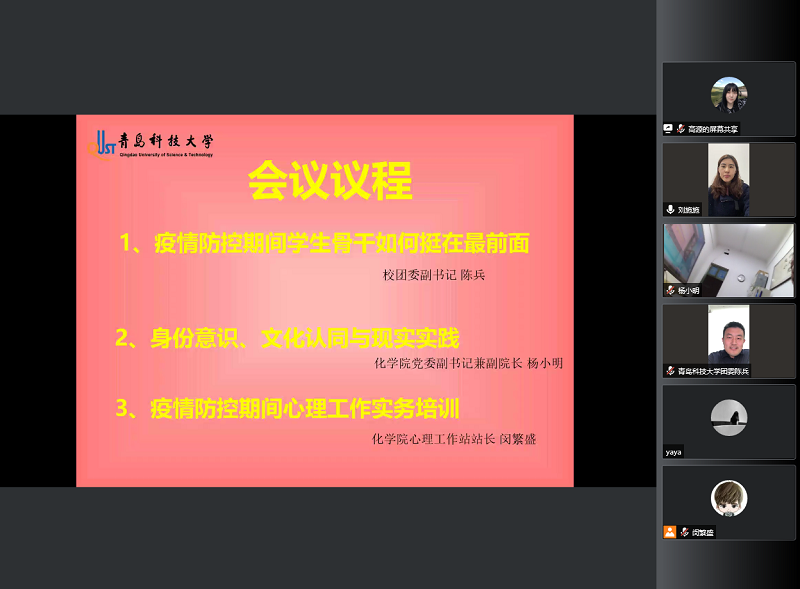 确保一线服务,提高工作效度。学院召开学团骨干线上交流会,校团委副书记陈兵就学生骨干志愿者、青年突击队等一线服务人员进行培训。陈兵指出:当代青年学生骨干在关键时刻要冲上去。一是要提高认识和站位,坚持“以服务同学”为理念,将自身融入学校疫情防控工作大局,充分发挥学生骨干的战斗堡垒作用和青年党员的先锋模范作用。二是要熟悉和准确掌握学校防疫制度,提高科学认识,强化防疫知识,带头做到不信谣、不传谣,做好宣传引导工作,正确面对当前疫情形势,全力以赴打赢这场疫情防控阻击战。三是带领同学走出宿舍、走向操场,在疫情防控期间增强体质,提高自身免疫力。杨小明就学生骨干身份意识、文化认同与社会实践与大家展开交流,化学院心理工作站站长闵繁盛就疫情防控期间心理工作开展实务培训。