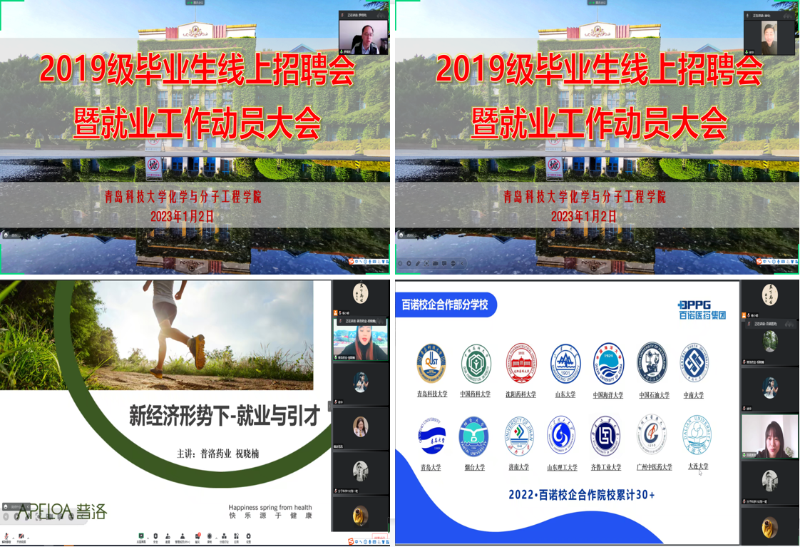 1月2日,化学院2019级毕业生线上招聘会暨就业动员大会线上举行,引导青年学生“离校不离心、求职不断线”。校党委常委、副校长、国产内射老熟女AAAA∵院长罗细亮,普洛得邦、百诺医药、鲁南制药人力资源负责人,校学生处副处长徐华,学院党委书记王德宝,光电传感与生命分析重点实验室执行主任丁彩凤,副院长高洪涛,学工办全体辅导员,2023届全体毕业生近300人参加会议,学院党委副书记杨小明主持会议。