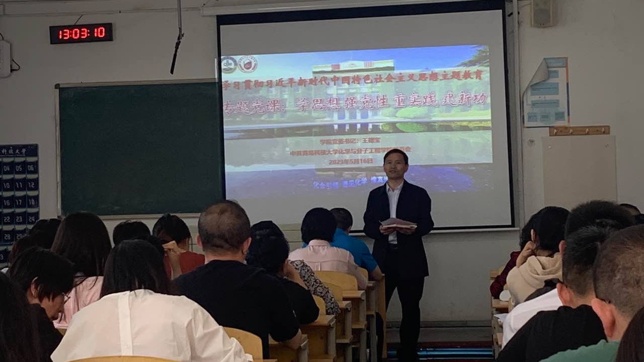 5月16日,化学院党委在2教121开展学习贯彻习近平新时代中国特色社会主义思想主题教育“学思想、强党性、重实践、建新功”专题党课学习。学院全体教工党员参加学习,学院党委书记王德宝主讲。