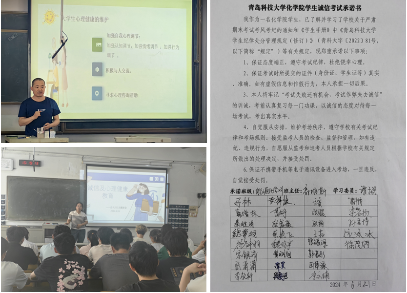 班会上,班主任深入讲解了考风考纪的重要性,强调考试是对学生学习成果的有效检验,也是对学生诚信品质的重要考验,并提醒同学们做好考试复习工作,合理分配时间,避免出现临阵磨枪、考前熬夜突击的情况。同时叮嘱同学们在考试过程中要保持冷静和自信,保持平和的心态,从容备考、应考。随后,班主任根据班级实际情况,结合典型案例,讲解考试违纪违规的后果和不良影响,组织全体同学学习《青岛科技大学学生纪律处分管理规定(修订)》,确保每位学生完全知晓并理解考场纪律的相关规定,引导同学们增强守纪意识,规范文明考试行为。会后,组织每名同学签订了《诚信考试承诺书》。