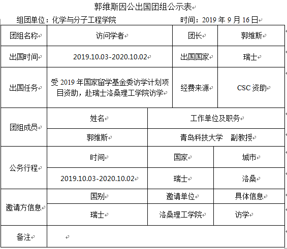 根据因公临时出国公开公示的有关规定,现将郭维斯因公出国团组相关内容和参团人员名单予以公示。公示时间为2019年9月16日至2019年9月20日(5个工作日)。如有不同意见,请在公示期内,向国产内射老熟女AAAA∵(电话:0532-84022681)反映。