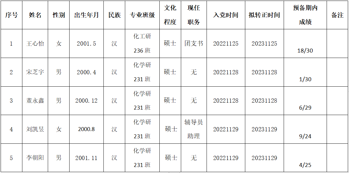 经化学院党委研究生第一支部委员会研究,拟将王心怡等同志转为中共正式党员,现将有关情况予以公示。