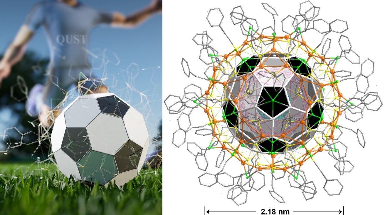 近日,我院汪恕欣教授团队报道了迄今为止最大的具有确定结构的Ag-Cu合金纳米团簇—Ag135Cu60(S(CH2)2Ph)60Cl42(以下简称Ag135Cu60),该纳米团簇具有一个世界上最小的Ag质足球形内核(图1),并且兼具分子和金属状态。相关成果以“Structure and optical properties of an Ag135Cu60 nanocluster incorporating an Ag135 buckminsterfullerene-like topology”为题,于2025年1月14日在线发表于Nature Synthesis期刊。