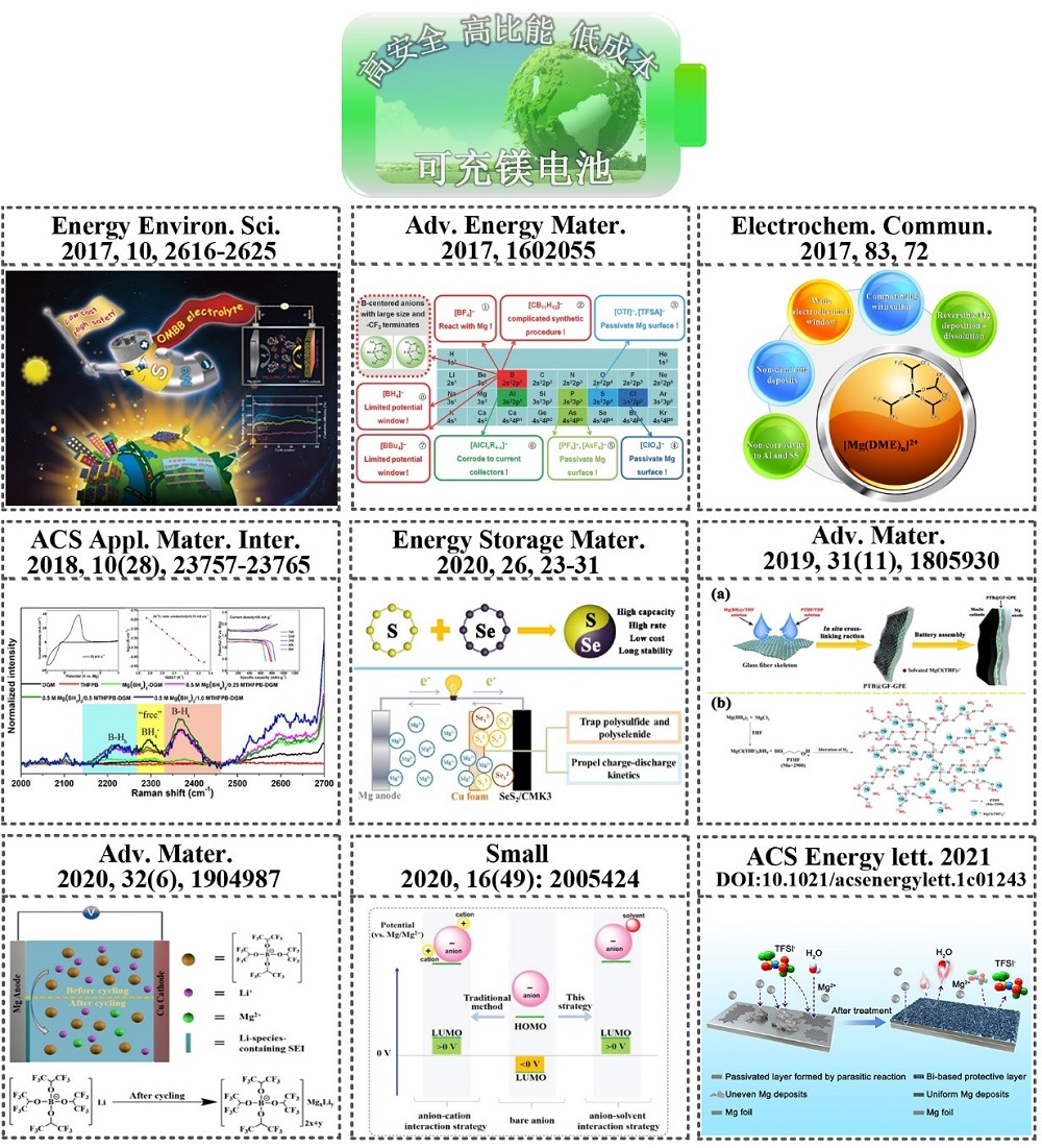 近年来,青岛科技大学化学院周新红团队及其合作者们在高性能及高安全的可充镁电池研究方向上做了大量系统深入的前瞻性研究,尤其在新型镁电解质体系开发和镁金属负极界面改性两大方向都取得了重要的阶段性进展,得到了国际同行的高度认可。