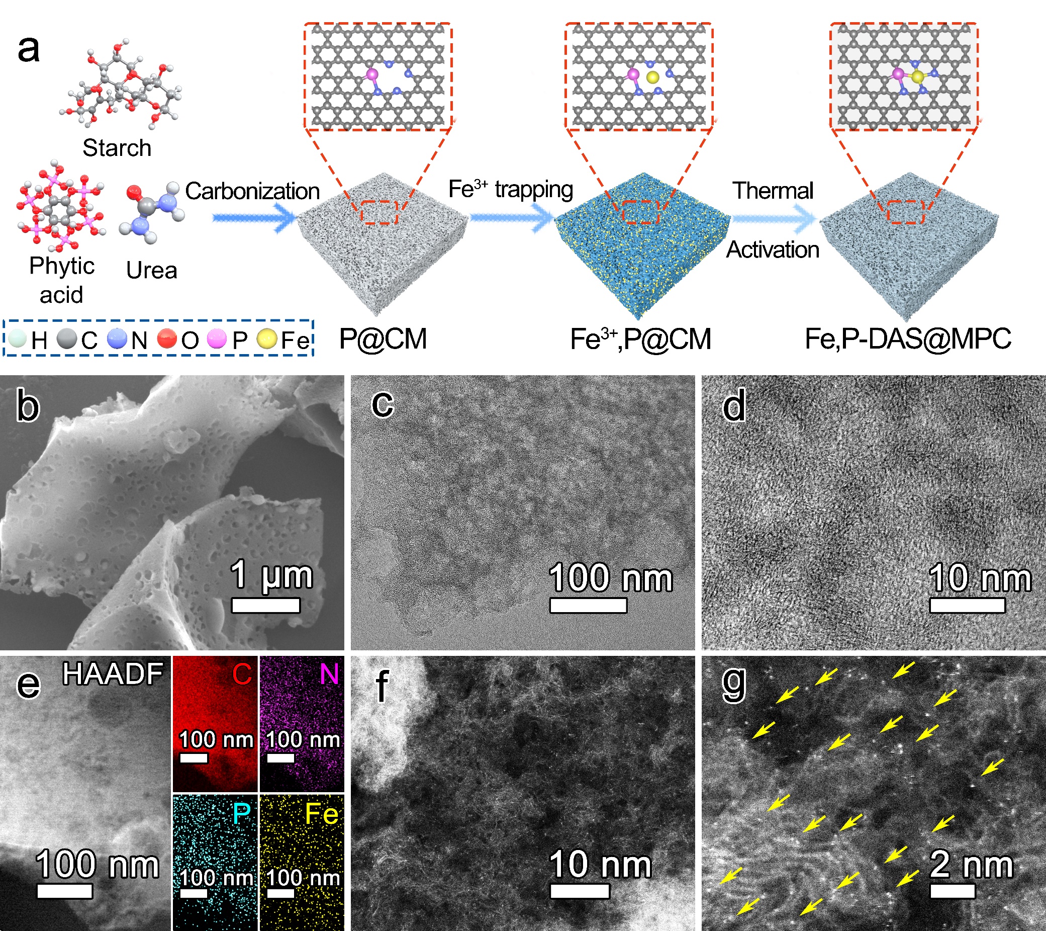 我校生态化工过程与技术泰山学者优势学科人才团队宗玲博副教授创新地采用两步策略,在多孔碳中成功制备了具有Fe,P双原子位点的单原子电催化剂(Fe,P-DAS@MPC)。研究表明:P原子位点能够有效调控反应中间体在邻近Fe活性位点的吸附构型与吸附能。特别是,Fe,P双原子位与反应中间体之间存在的氢键作用有利于ORR中间体的吸/脱附,加速了ORR反应动力学。该研究为双原子活性位点的合理设计提供了重要启示,为多活性位点新型单原子电催化剂的大量制备提供了新的研究思路与可行性方案。