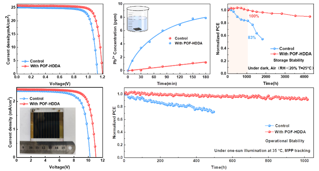 青岛科技大学周忠敏教授团队与合作者报道了一种有机小分子单体八氟-1,6-己二醇二丙烯酸酯(OF-HDDA)引入钙钛矿薄膜通过末端烯烃发生原位交联形成聚合物(POF-HDDA),获得高性能高稳定性且低铅泄漏的器件与模组。POF-HDDA克服了小分子波动大、扩散系数高、在钙钛矿内部分布不均匀等缺点。该文章提出了通过热交联形成聚合物的策略,羰基锚定钙钛矿中未配位的Pb2+,减少铅的泄漏。同时通过钝化内部Pb相关和I相关缺陷调节钙钛矿膜的结晶,降低陷阱密度,释放晶格应变,促进载流子的运输和提取。进而获得高性能高稳定的低铅泄漏的器件和模组。