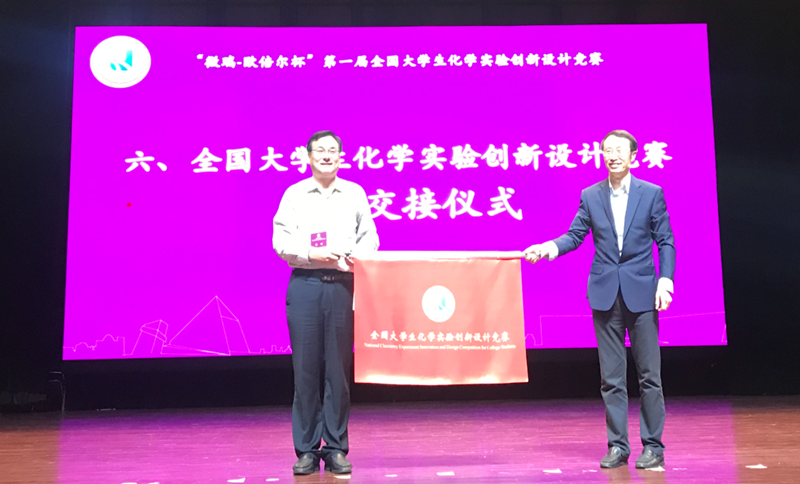 10月11-13日,在南京大学举行的“微瑞-欧贝尔杯”第一届全国大学生化学实验创新设计竞赛中,我校参赛队获全国二等奖。同时,我校获第二届大赛承办权,教育部化学教指委副主任、大连大学校长孟长功与我校学生处处长、创新创业学院执行院长陈刚进行会旗授予仪式。