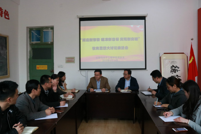 4月16日下午,化学学院党总支在学院党员活动室召开“顺应新形势 瞄准新目标 实现新突破”教育思想大讨论推进会。学院全体党支部书记参加会议。会议由学院党总支书记王德宝主持。