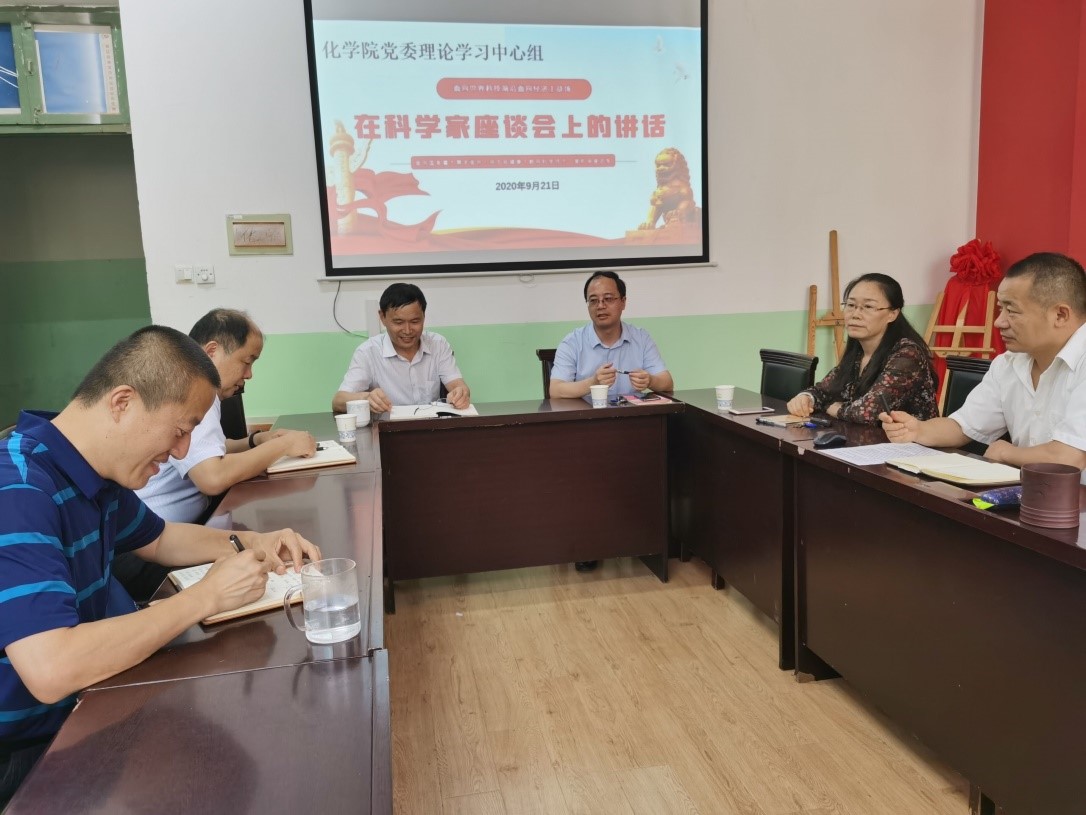 9月21日下午,化学院党委理论中心组在一政楼223党建活动室开展习近平总书记在科学家座谈会上讲话精神专题学习,学院党委理论中心组成员参加会议。会议由学院党委书记王德宝主持。