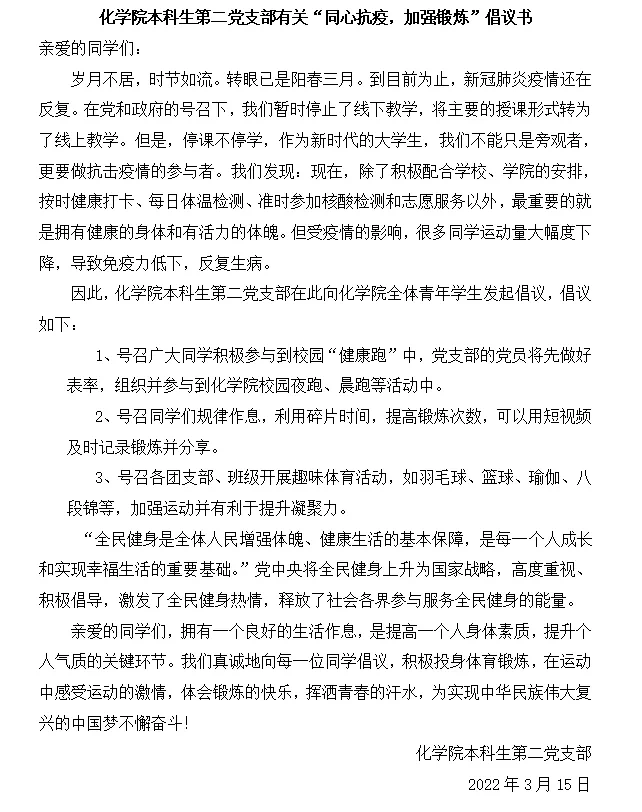 3月24日晚,为响应化学院本科生第二党支部发起的“同心抗疫,加强锻炼”的倡议,党支部组织了校园夜跑活动。学院党委书记王德宝,党委副书记兼副院长杨小明莅临现场指导,党支部书记刘施施、学院辅导员们和39名学生党员、入党积极分子参与夜跑。