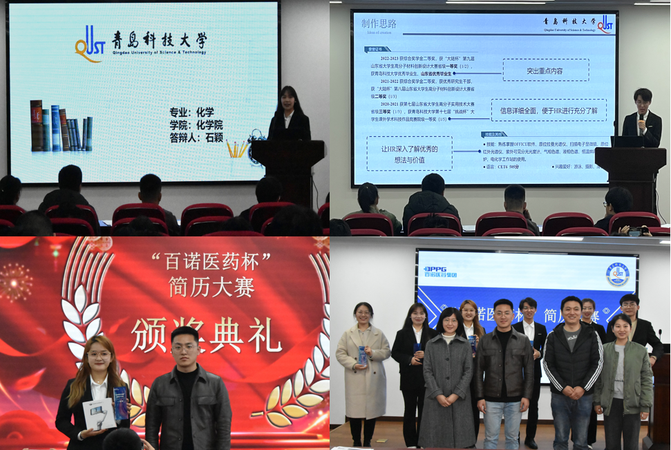 4月4日,“百诺医药杯”化学院大学生简历大赛在四方校区CCF814会议室成功举办。山东百诺医药人力资源部田新宇先生、化工学院辅导员刘雪玲、化学院辅导员闵繁盛、昝祺祺担任评委,化学院《大学生职业生涯规划》课程的同学代表观摩简历大赛决赛环节。