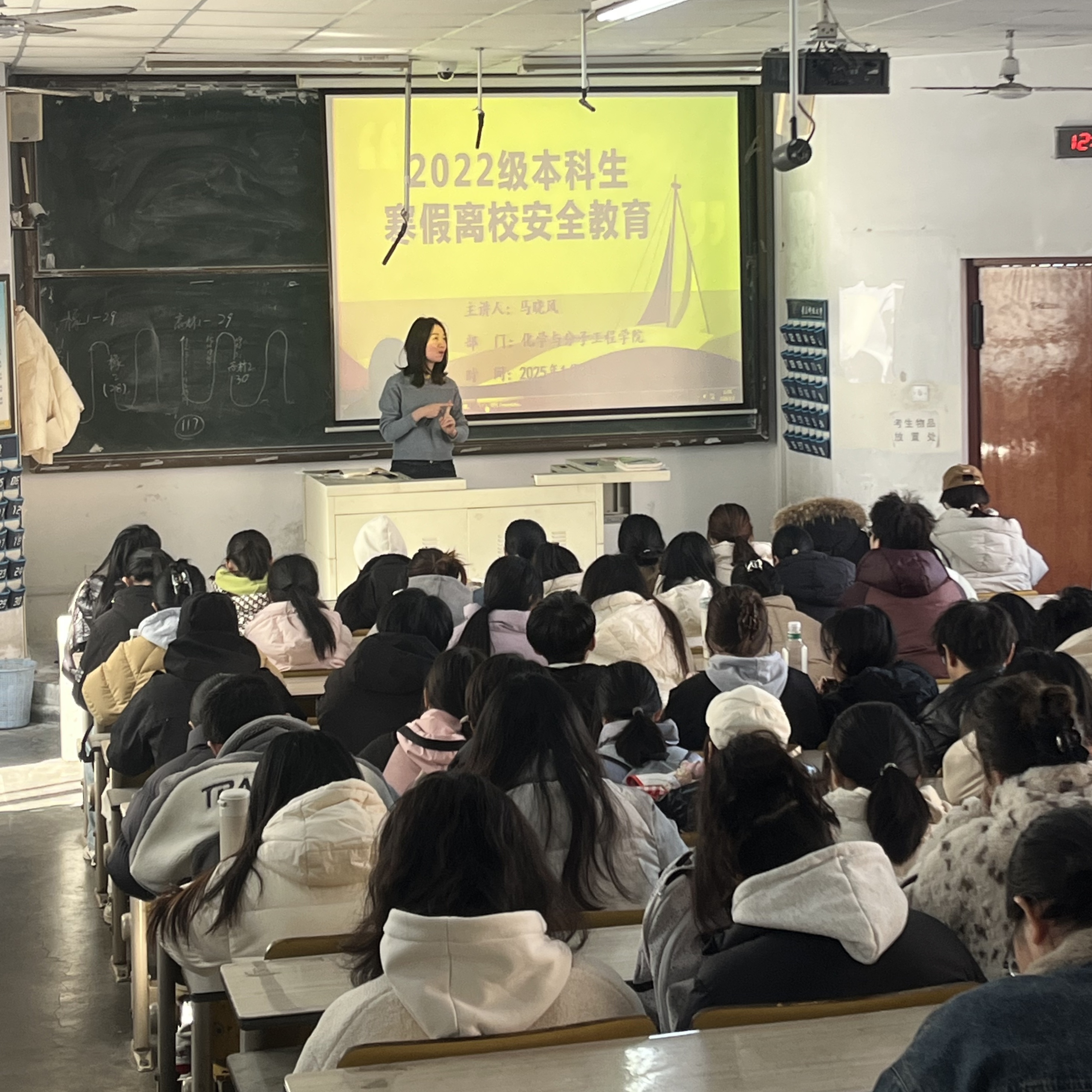 寒假将至,为确保学生能够安全、有序地离校返家,度过一个平安、愉快的假期,化学院于1月10日在第二教学楼201开展了2022级本科生寒假离校安全教育讲座。本次讲座由2022级辅导员马晓风主讲,旨在增强学生的安全意识,提供实用的安全指南,并为同学们规划一个充实而有意义的假期生活。