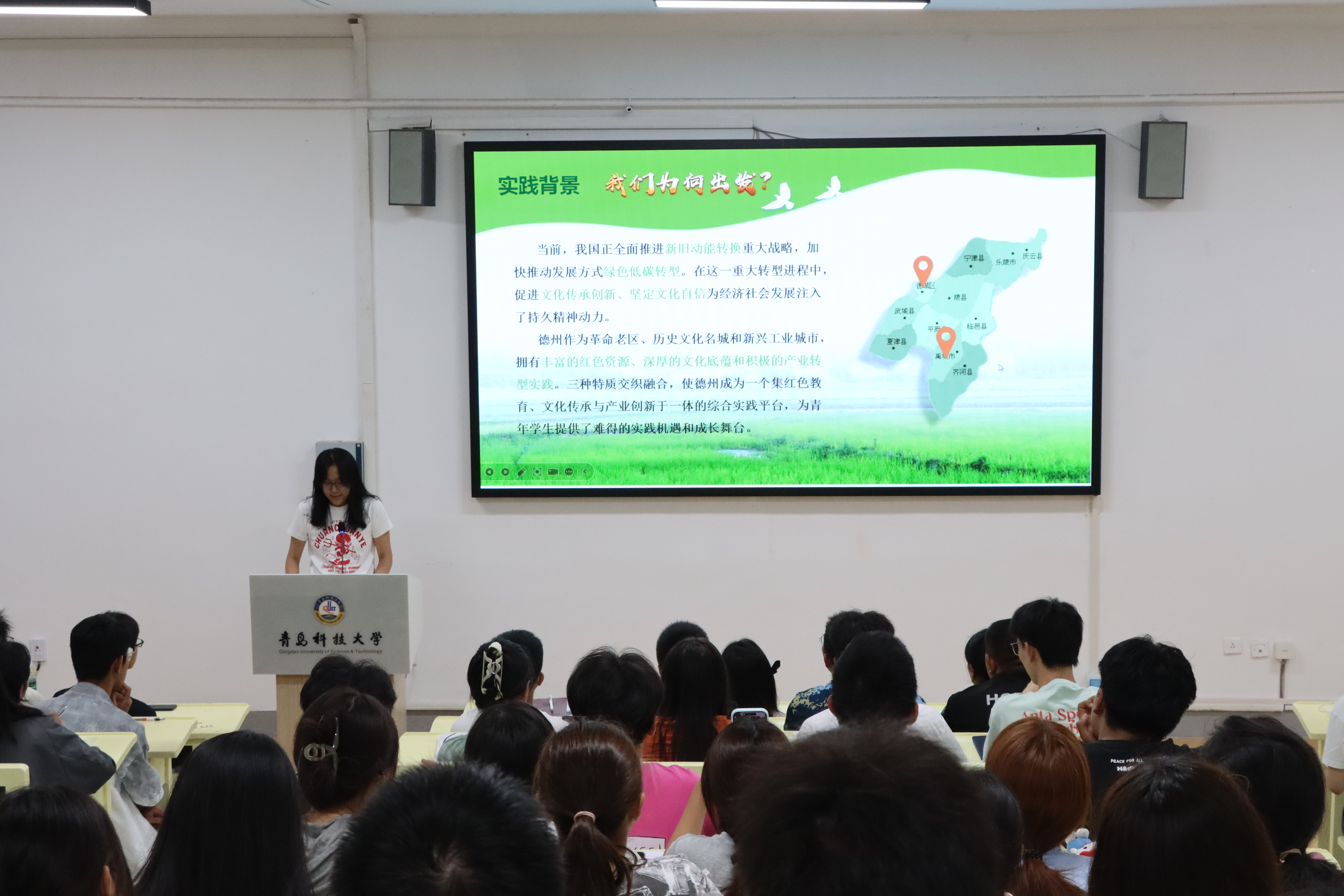 各实践团队代表们从实践地点、类型、活动内容等全方位地展现了在社会实践过程中团队的收获与体会,交流了自己在实践期间的观察、体验和感悟。赴德州市“循绿探新”强省建设实践团队长刘栩宁详细介绍了团队社会实践的整个流程,团队通过实地探访革命场馆、文化地标与高新企业,缅怀革命英烈,探寻传统文化根脉,调研绿色发展实践。