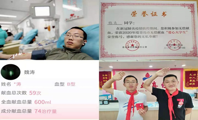 化学院研182班的魏涛在高考后完成了人生中第一次献血,从此开启了无偿献血的公益行为。截至2021年4月,他累计献血59次,全血献血总量600 mL,成分献血总量共74治疗量;本科期间,加入了青岛科技大学红十字会,多次参加青岛市中心血站参观交流活动,进行无偿献血的宣传工作,并积极参加“无偿献血车进校园”的志愿活动;于2015年3月1日进行了第一次长达40分钟的血小板1个治疗量的捐献;2016年进行了骨髓造血干细胞的留样并顺利加入中国骨髓库,以实际行动为五湖四海的朋友贡献爱心。2020年,他收到了青岛市无偿献血荣誉卡,并获得2020年度青岛市无偿献血“爱心大学生”荣誉称号;2021年,他收到了全国无偿献血奉献奖金,切实感受到了党和国家对无偿献血志愿者的关心,也进一步加强了“无偿献血,拯救生命”的信念。