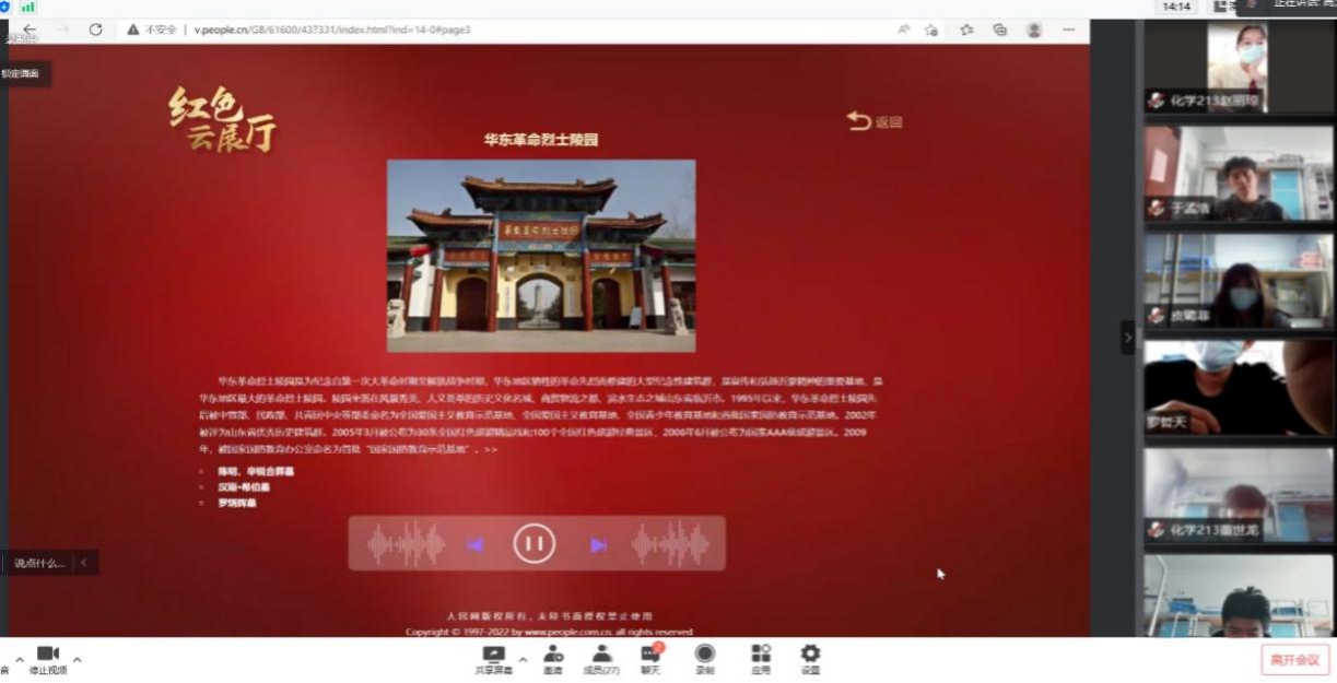 科技创新,线上观展。红色云展厅中的展示上让每一位同学铭记在心,团支部选取山东当地的华东革命烈士陵园进行线上观瞻。“红色云展厅”不仅向我们展示了英雄先烈的光荣事迹,而且其中蕴含的精神让大家在线上得以体悟。