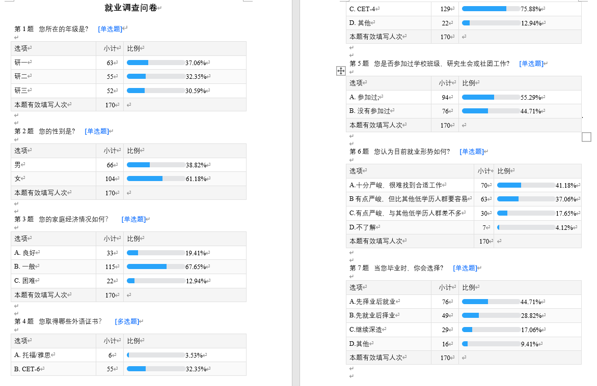 本次就业调查活动收获了170份数据,占比化学院在读硕士研究生的半数左右,可以体现化学院全体研究生对就业相关问题的看法。其结果如下: