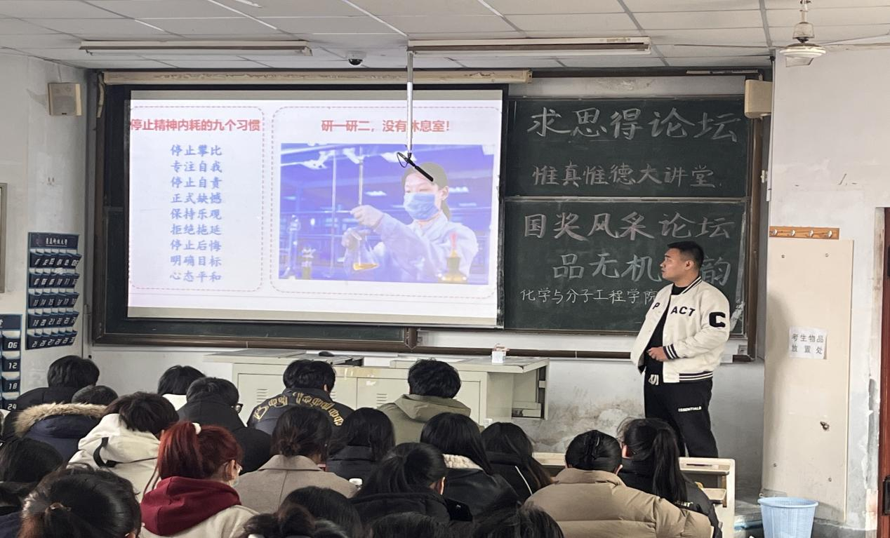 2024年3月16日,化学院研究生于四方校区第一教学楼202室开展“求思得”论坛:“化里化外,研学研趣”分享会。此次分享会主题为心怀“无机”志创新,思想引领强国行。邀请化学院2023年国奖获得者张家康、王月、王成斌出席并分享心得,化学院全体研究生参与此次活动,刘凯昱任主持人。