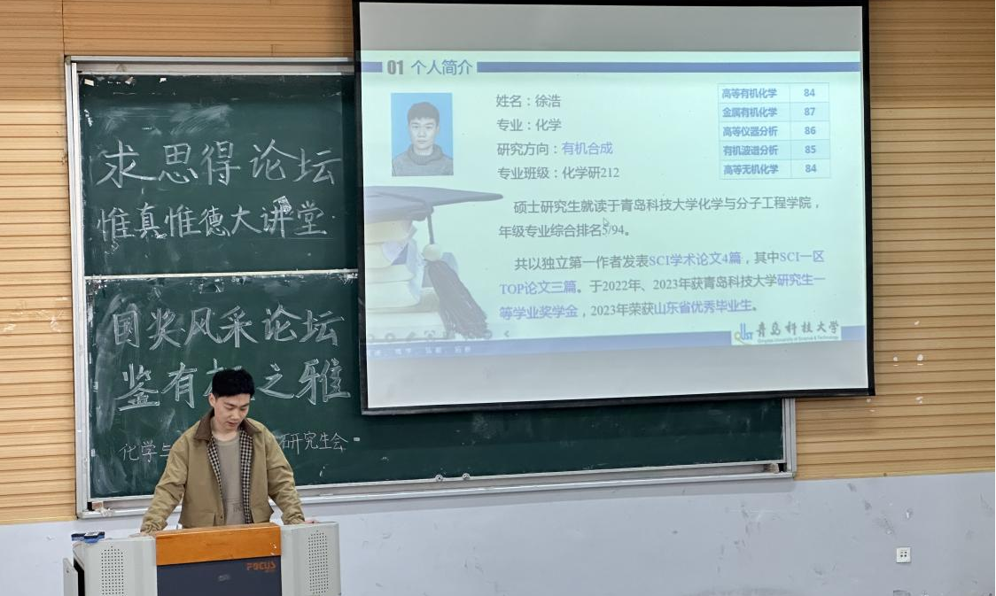 为帮助研究生解答科研生活中的困惑,助力研究生专业成长与全面发展,激发我院研究生对科研的热情,推动有机化学领域的学术交流,打造深厚的学术底蕴,进一步强化化学院“惟真惟德”的学风建设。2024年3月30日下午,化学院研究生在二教101室开展“求思得”论坛:“化里化外,研学研趣”——鲜衣怒马少年时,不负韶华知“有机”专题报告会。本次分享会邀请2023-2024年研究生国家奖学金获得者徐浩作为主讲嘉宾。