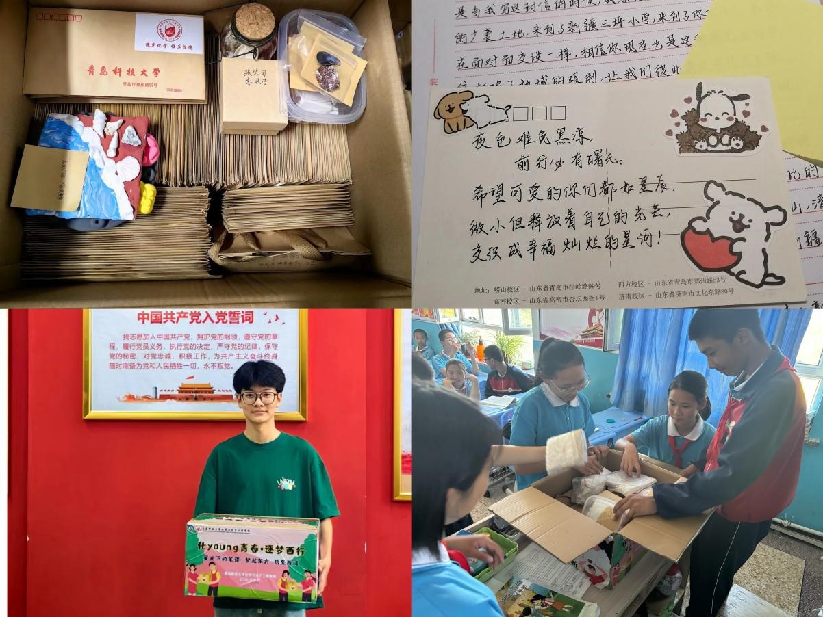 “大学是什么样子的”、“你们那里出门就能捡到贝壳吗”、“数学好难呀,有没有什么学习技巧”……同学们通过书信的形式,寄出自己的困惑和好奇,在同学们的期待中,300多封带着温度的回信跨越3000多公里,从青岛科技大学来到了三坪农场子女学校。信中,小分子志愿服务团的成员们用温暖的笔调对来信进行了回应,介绍了有趣的大学生活,表达了对同学们生活、学业的关心,并为同学们送上了美好的祝福与期许。