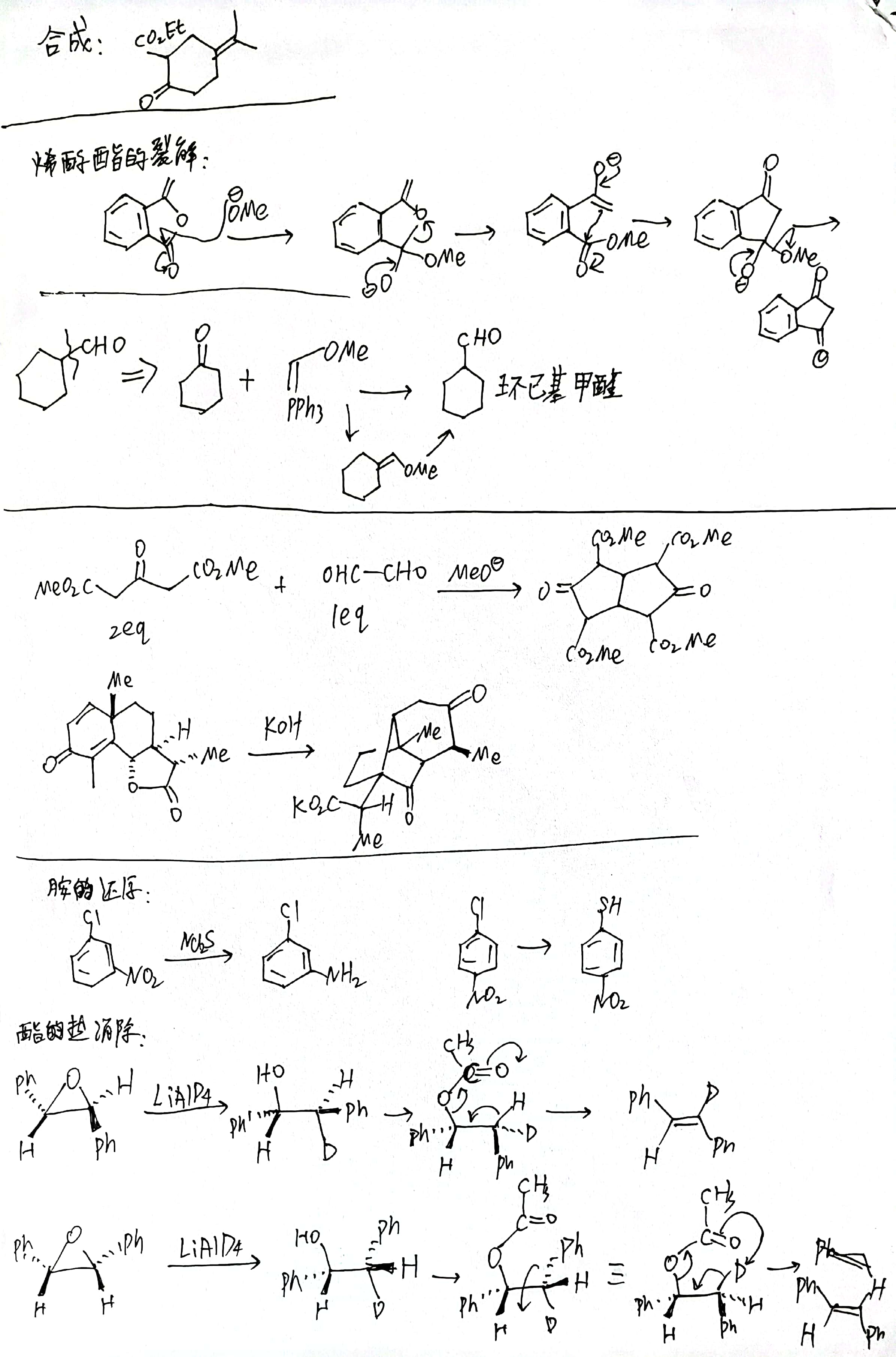 进入十一、十二月份,就到了最后的冲刺阶段,除了每天刷题保持手感外,不要只苟且于做题,看到自己不熟悉或者磕磕绊绊的地方就得过且过了,每次做题都写上自己的理解和一些平常注意不到的细节,及时地在纸上记录下来(不一定必须准备错题本,记录下来的东西可以夹在书里,一定要能让自己随时看到)比如次磷酸可以对重氮盐进行还原,卡宾加成中单线态卡宾和三线态卡宾的区别,苯酚可以通过芳基卤和叔丁基锂进行锂卤交换再和硼酸反应后水解来制备,烯醇负离子的6种生成方法,Diels-Alder反应中次级轨道作用控制的endo和exo的立体专一性和EDG/EWG诱导的区域选择性,路易斯酸催化下的Nazarov关环,以及常见的金属催化反应(Suzuki/Kumada偶联中转金属化过程,Heck反应催化循环机理,Sonogashira偶联中对碳的杂化要求,etc.),这些都静静地躺在书里,你都注意到了吗?